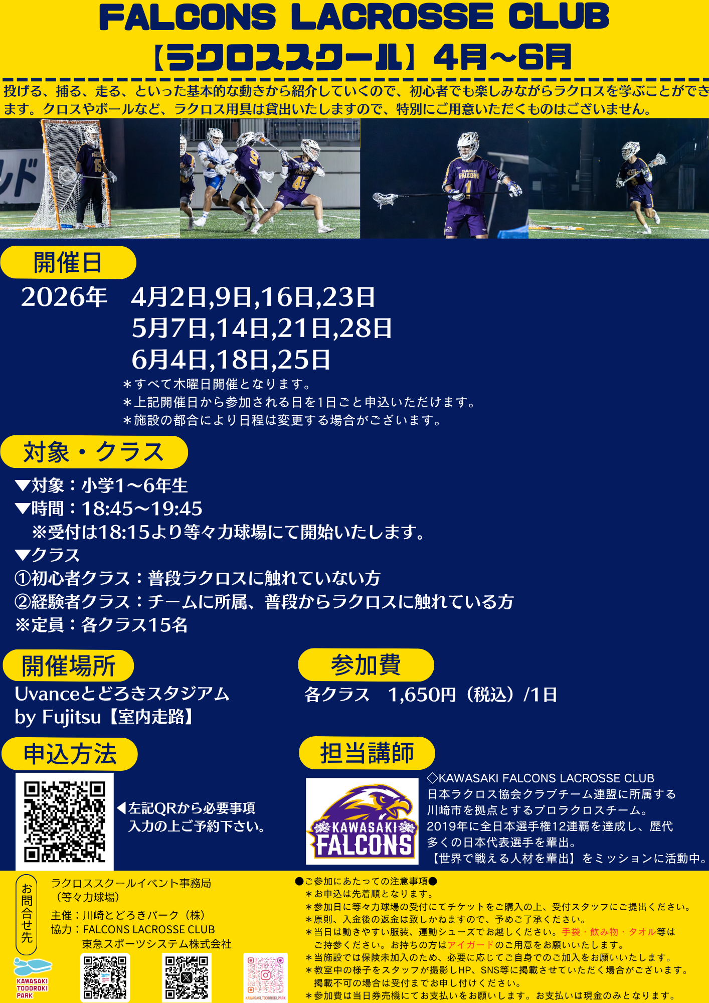 【Uvanceとどろきスタジアム by Fujitsu】FALCONS LACROSSE CLUB「2026年4月~6月ラクロススクール」開催!!